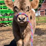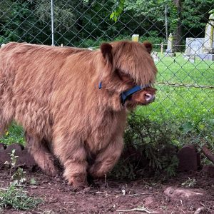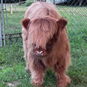 This handsome little bull features a thick, fluffy coat, expressive eyes, and the classic Highland look in a smaller, more manageable size. He is well-socialized, calm, and accustomed to human interaction, making him easy to handle and a joy to be around.