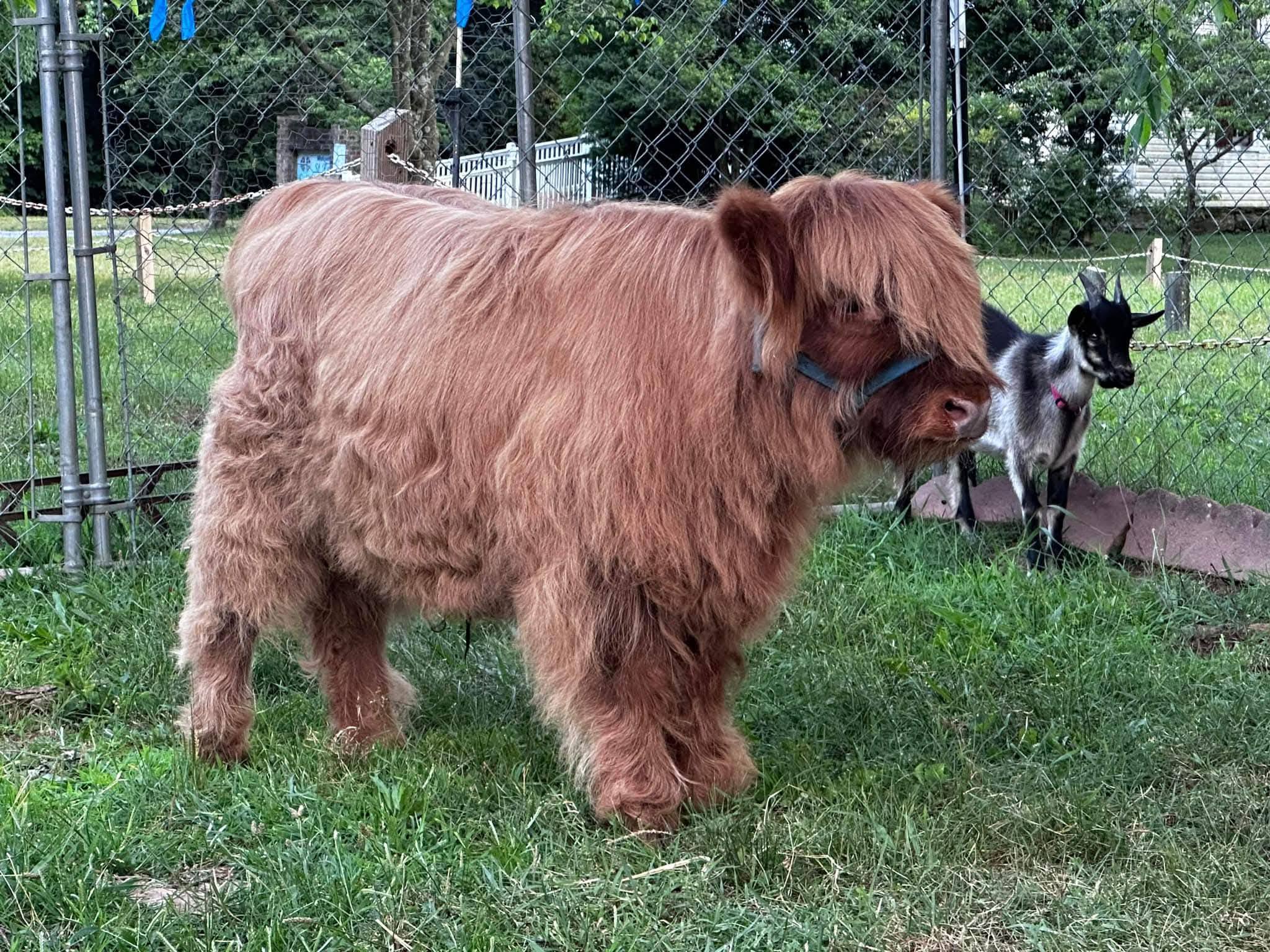 Teddy is a tiny and super hairy, unique little micro-mini bull calf! He is the smallest bull calf we have had born on the farm yet, and did I mention, has GREAT, long fluffy hair!? He is chondro-positive and is naturally polled (will not grow horns) but can produce horned offspring. Take him home today.